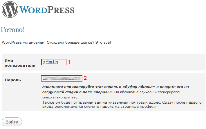 7. Осталось только скопировать данные из полей Имя пользователя (рис. 11; обл. 1) и Пароль (рис. 11; обл. 2) в текстовый файл и поместить его в надёжное место. Данные понадобятся для входа в Административный раздел сайта, для чего в адресной строке браузера вводим https://вашсайт/wp-login.php