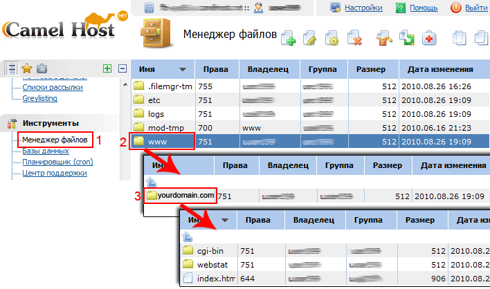 3.1. Переходим в раздел Менеджер файлов (рис. 2; обл. 1). Заходим в корневую папку нашего домена (рис. 2; обл. 2, 3)