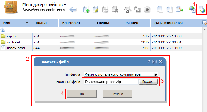 Менеджер файлов: не поддерживает загрузку сразу нескольких файлов или папки с файлами, поэтому необходимо предварительно запаковать содержимое папки wordpress в zip архив и после этого загрузить его на сервер в папку домена. Рассмотрим данный пункт более подробно.