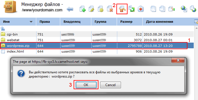 Обратите, пожалуйста, внимание на то, что необходимо архивировать именно содержимое папки wordpress в архив, а не саму папку. Поскольку после распаковки на сервере структура архива полностью сохраняется, а нам необходимо, чтобы установочные файлы находились непосредственно в корневой директории нашего домена. Если случилось, что наши установочные файлы оказались в какой-нибудь иной директории кроме корневой, можно воспользоваться кнопками на панели управления Менеджера файлов.