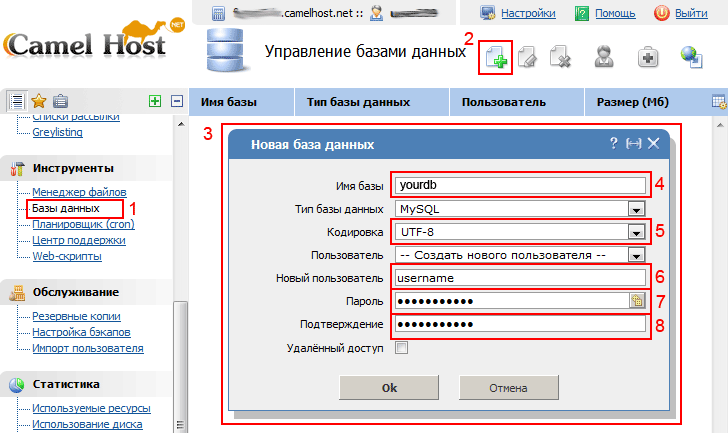 4. Теперь создадим базу данных для нашего WordPress. Идем в раздел Инструменты / Базы данных (рис. 6; обл. 1) и создаем базу данных, нажав на кнопку Создать базу данных (рис. 6; обл. 2). В открывшемся окне (рис. 6 обл. 3) заполняем поля, указываем название базы данных в поле Имя базы (рис. 6; обл. 4) , выбираем значение utf8 (потому что WordPress работает именно с этой кодировкой) в поле Кодировка (рис. 6; обл. 5), указываем имя пользователя базы данных в поле Пользователь (рис. 6; обл. 6). Наконец указываем и подтверждаем пароль в полях Пароль и Подтверждение соответственно (рис. 6; обл. 7, 8). После того как заполнены все поля нажимаем кнопку ОК.
