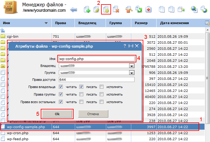 5.1. Переходим в раздел Менеджер файлов устанавливаем курсор на файл wp-config-sample.php (рис. 7; обл. 1), затем нажимаем на кнопку Изменить параметры файла (рис. 7; обл. 2). В открывшемся окне (рис. 7; обл. 3) изменяем в поле Имя (рис. 7; обл. 4) название файла на wp-config.php. Далее нажимаем кнопку ОК (рис. 7; обл. 5).
